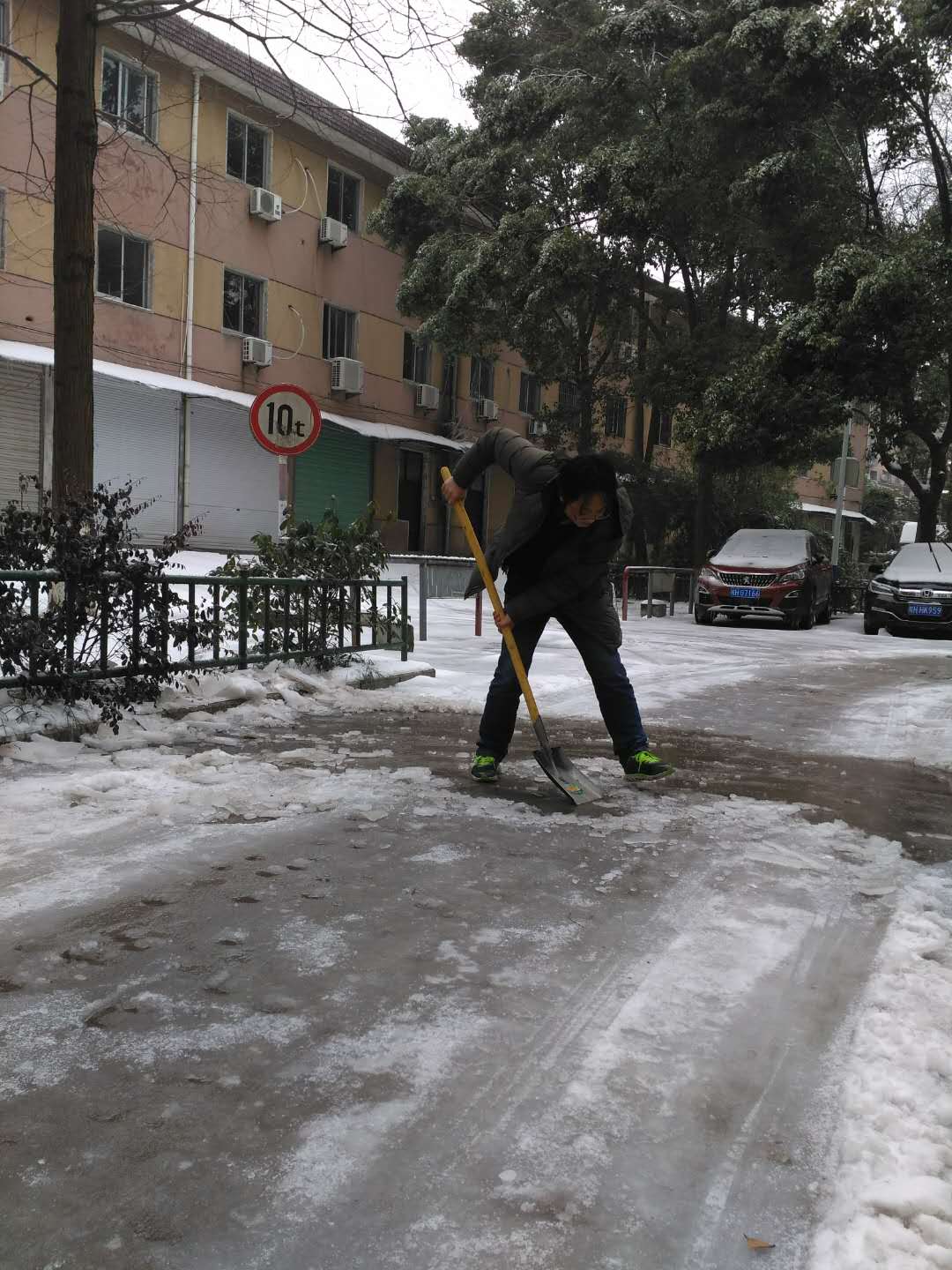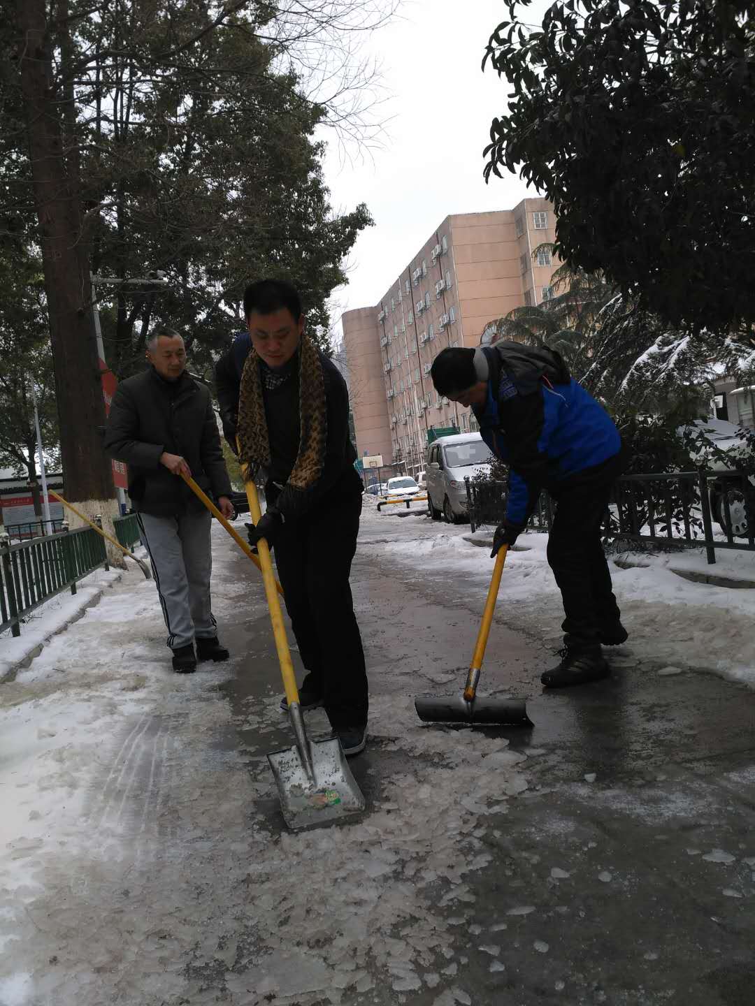 上午九时许,大家拿着准备好的铁锨、大扫帚等工具,在零下的温度,冒着刺骨的寒风,纷纷挥动手中的工具,一起努力凿冰、铲雪、扫雪,干劲十足。大家表示:“作为党员,就要不怕苦、能吃苦,党员的先锋模范作用就应该用行动体现出来。”。天寒地冻挡不住大家的热情,铁锹声和扫地声此起彼伏。在和其他部门和物业公司的共同努力下,保卫处党支部党员克服了时间紧迫、积雪较厚、冻冰难除的难题,花了近一天时间,清扫出两校区主要路段的积雪,为师生出行提供了有力保障。